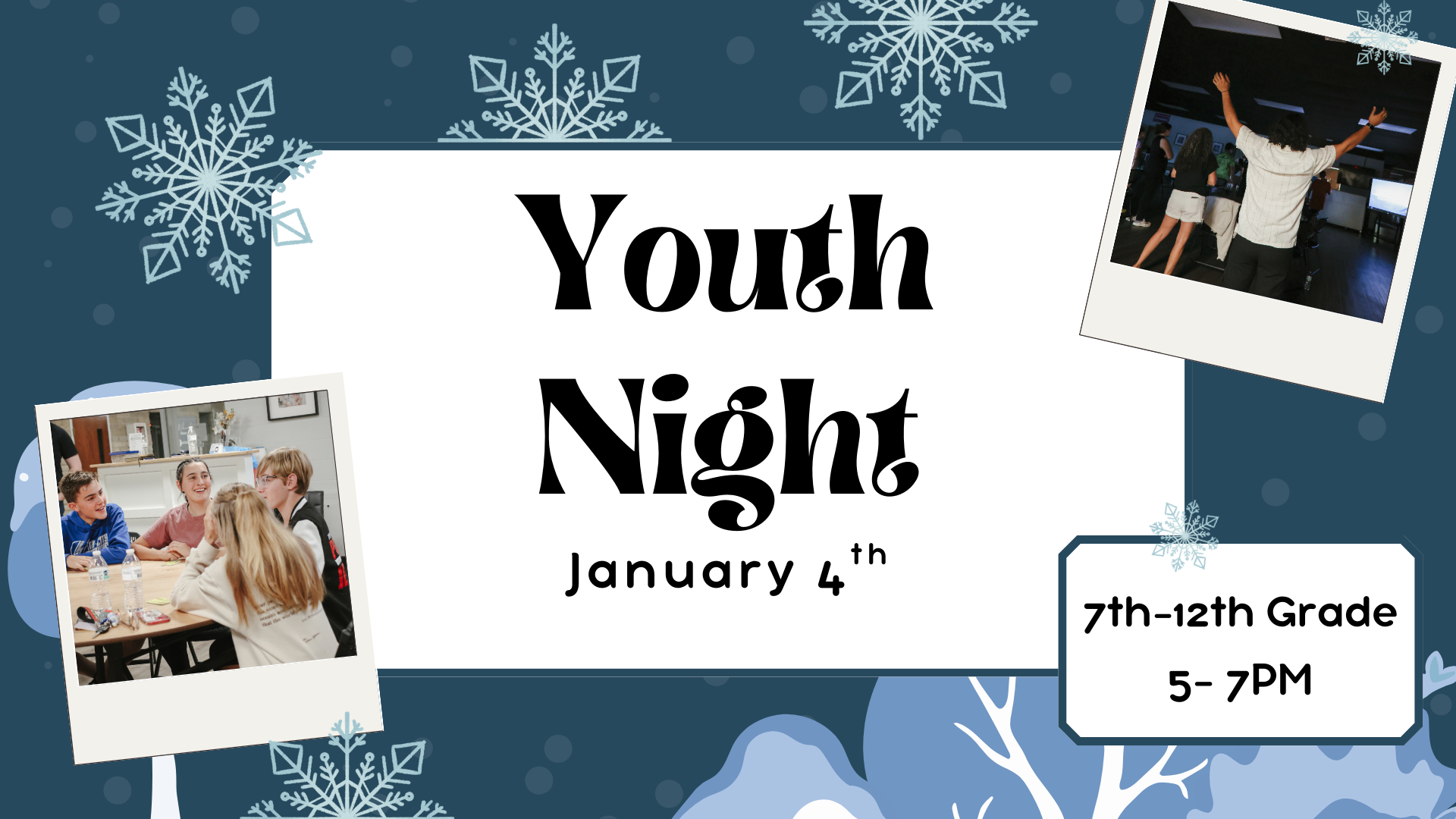 Are you a student in the 7th-12th grades? Join us for Youth Night coming up on Sunday, January 4th from 5-7pm. Youth Night is a great way for teens to fellowship, worship God together, and hear a message relevant to your age and the situations you face. Invited a friend and we look forward to seeing you there!