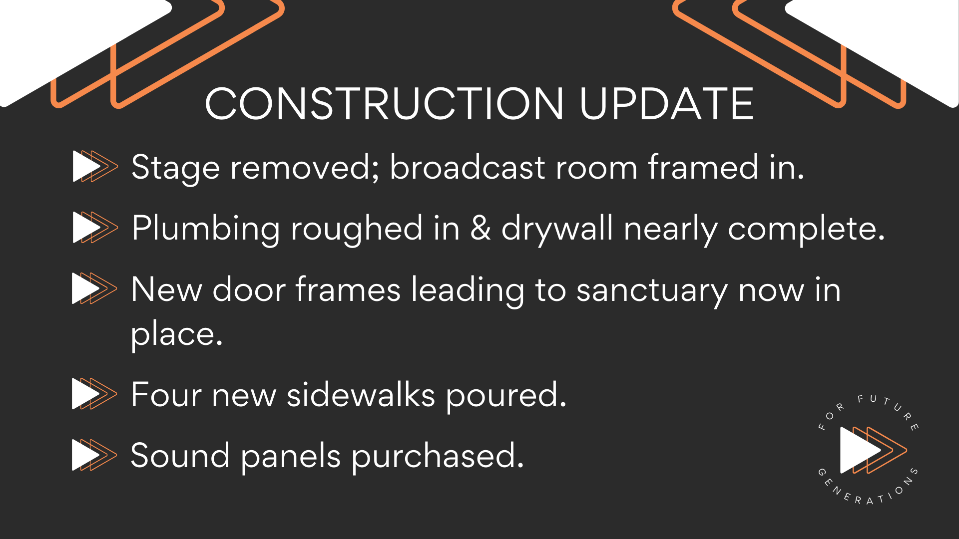 We continually celebrate God’s faithfulness here at Radiant with what He is doing through our For Future Generations building campaign. During our update on Sunday, May 18th, 2025, Pastor Marco shared a few important updates on our construction progress. Many projects are still under way and some are nearing completion. Please continue to pray for our on-site crews, contractors, and staff as we progress through to the completion of phase 1.