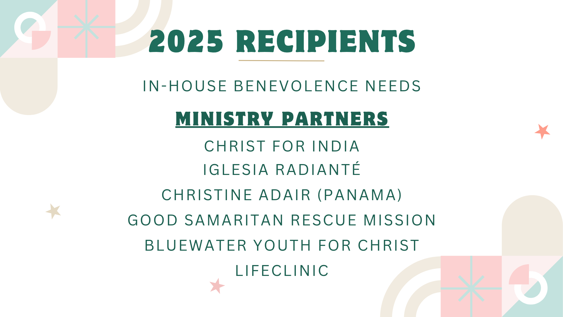 We are excited to announce this year’s holiday outreach, Give Hope 2025. On Sunday, November 30th, we will be taking up a special offering. Our goal is to raise $16,000! This year’s focus will be our in-house benevolence needs and giving additional support to our local and international ministry partners.